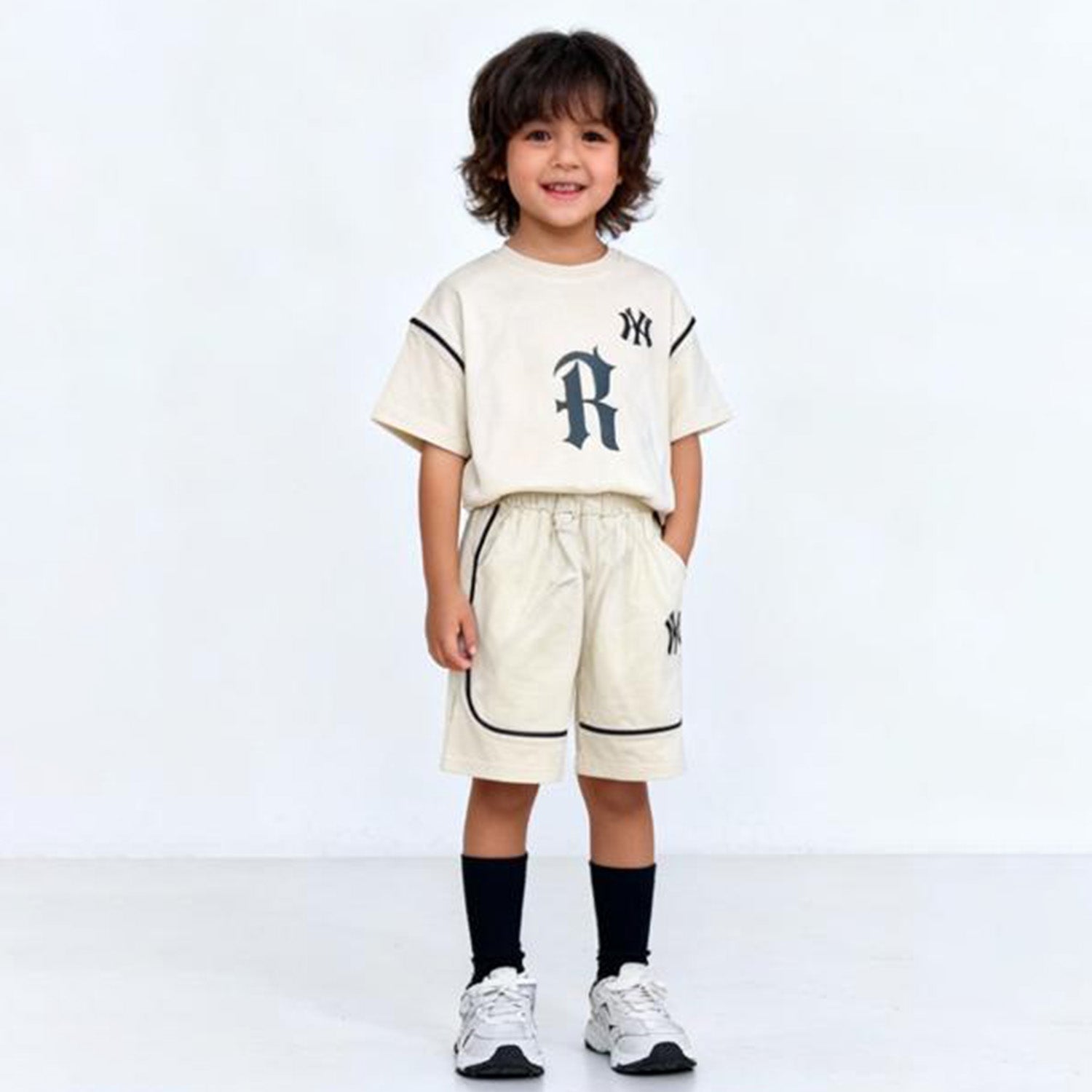 This sporty half-sleeve co-ord set features a cream T-shirt with bold varsity-style chest lettering and matching shorts, finished with contrast black piping and side logos for a baseball-inspired look. The soft, breathable fabric and elasticated waistband keep kids cool and comfortable, making it perfect for summer outings, park play, or casual daywear.