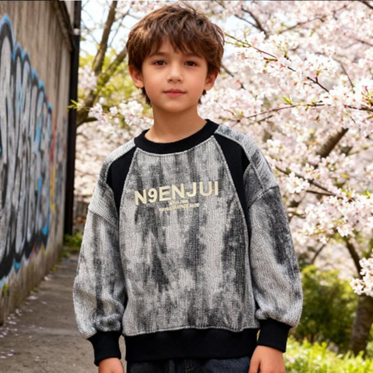 Designed for cool-weather style, this premium sweatshirt blends modern texture with everyday comfort. The washed grey finish paired with contrast black panels creates a refined street-luxury look, while the soft, cozy fabric keeps your little one warm all day. Finished with ribbed cuffs and a relaxed fit, it’s perfect for winter outings, casual layering, and standout everyday wear. A must-have for kids who love comfort with a bold, fashionable edge.