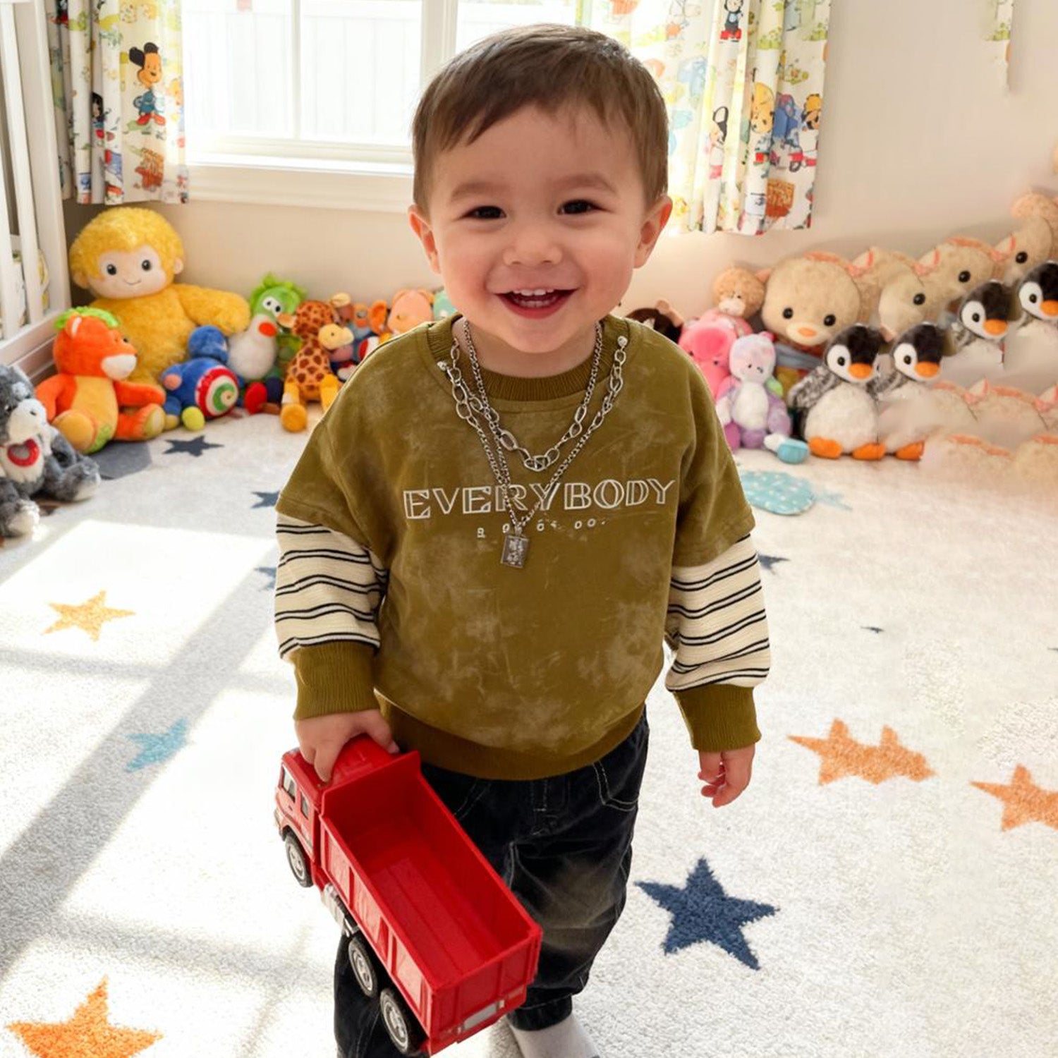 This trendy co‑ord set features a mustard tie-dye style sweatshirt with “EVERYBODY” text and built-in striped sleeve inserts that give a cool layered look without extra bulk. It pairs with dark-wash jogger jeans with bold contrast stitching and an elastic waist, creating a stylish everyday outfit with a streetwear edge.