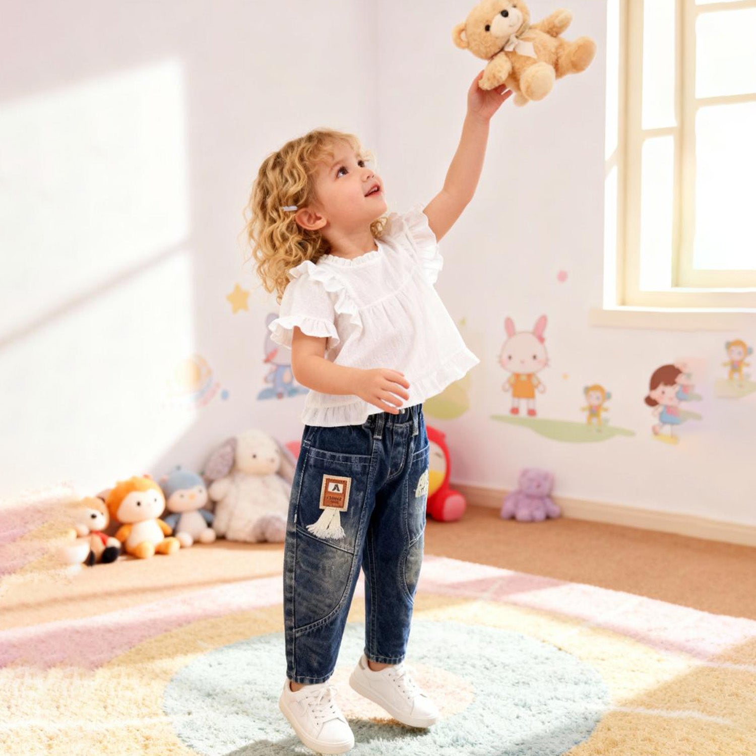Ripped Rebel Kids Denim jeans offer a bold look for energetic youngsters who love expressing their individuality. The jeans feature a light blue wash with trendy distressed rips and faded highlights throughout, providing a fashion-forward, urban style. Spacious pockets and an elastic waistband with a sturdy button closure guarantee comfort and freedom of movement during playtime. Crafted with durable denim, these jeans balance unique edgy looks and everyday practicality, perfect for kids ready to take on new adventures with attitude.
