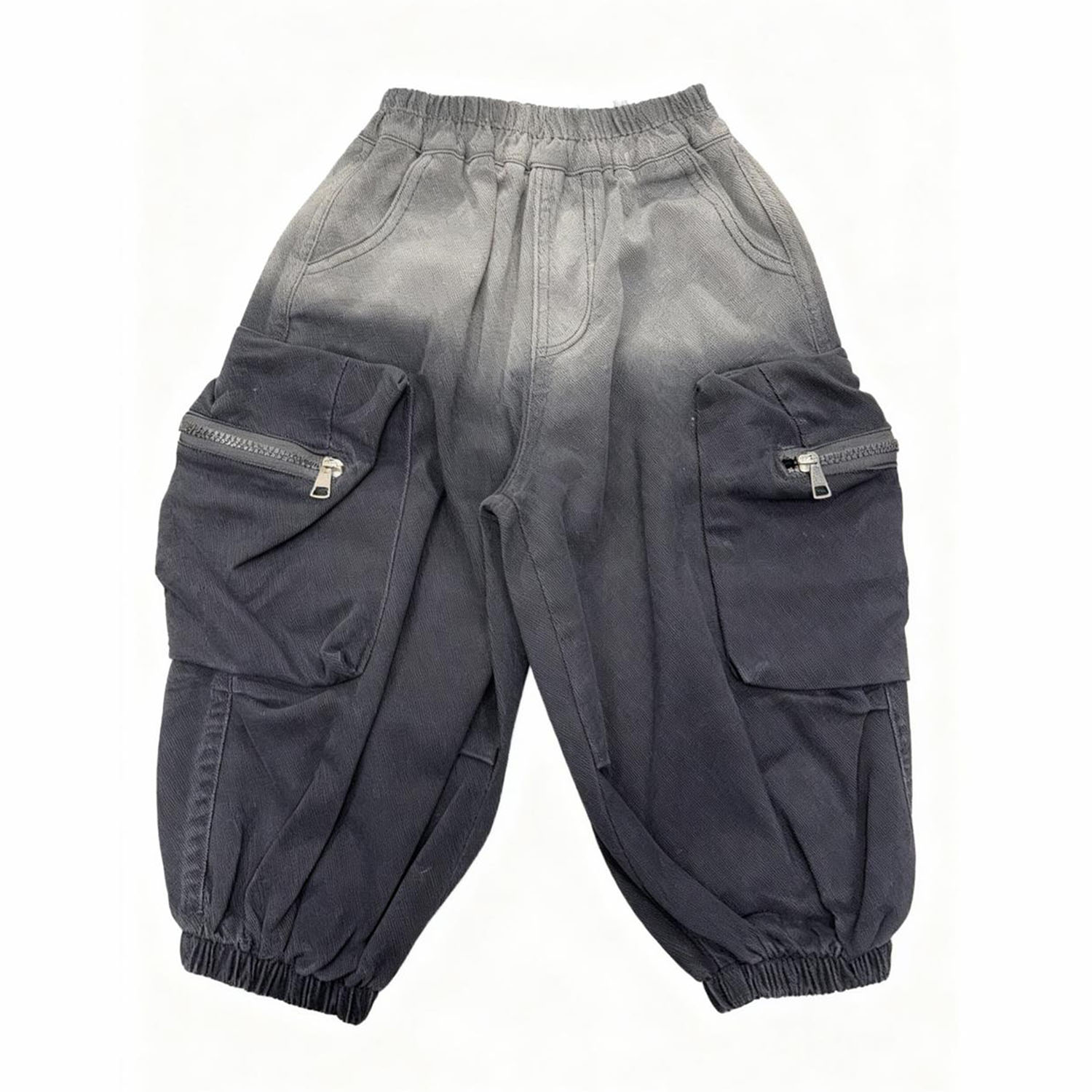 Shadow Fade Balloon Jeans blend striking style and practicality for kids who enjoy a standout look and unrestricted play. These jeans feature a unique gradient wash, transitioning from light gray at the top to deep black at the legs for a modern, edgy aesthetic. The exaggerated balloon fit provides comfort and plenty of movement, while large zipped cargo pockets serve both fashion and function. Sturdy elastic cuffs and waistband ensure a secure fit, and the heavy-duty denim fabric promises excellent durability, making these jeans a great choice for any adventure-loving child.