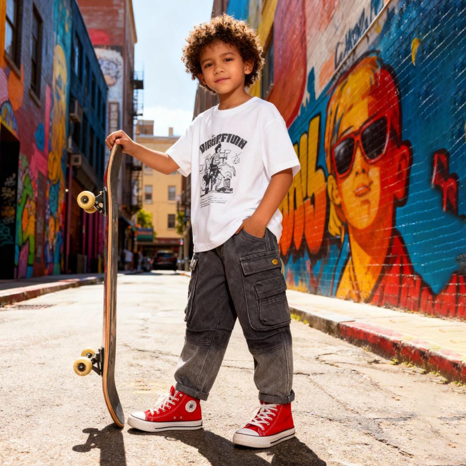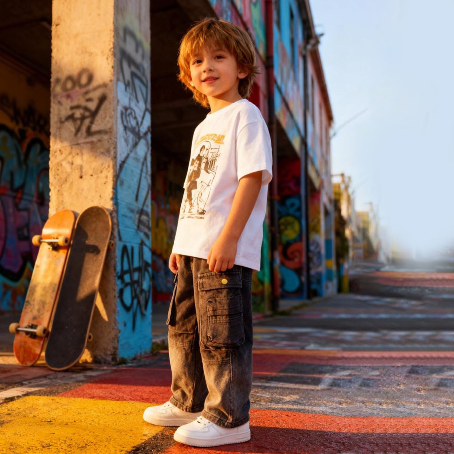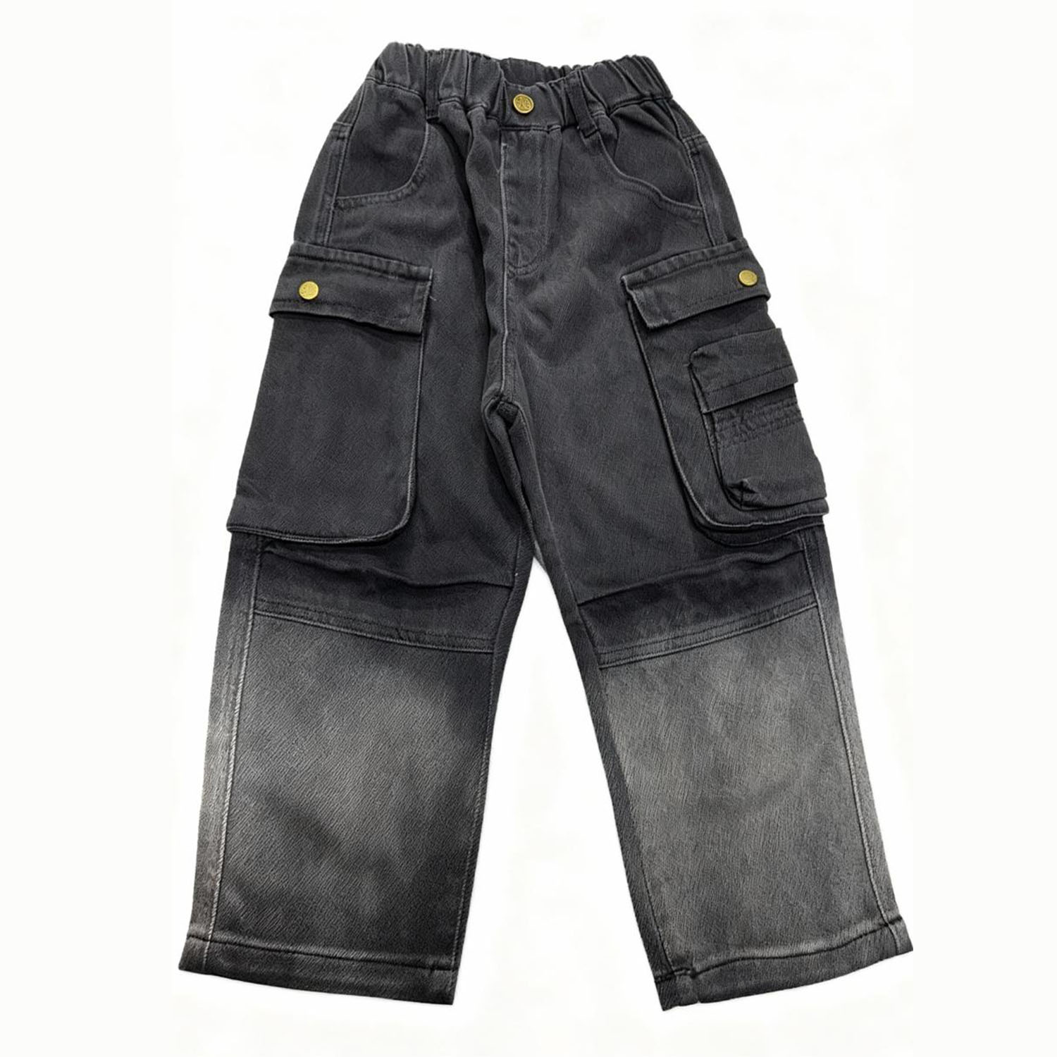 SoftTouch Contrast Cargo Jeans provide kids with an ultra-comfortable wearing experience thanks to their gentle, flexible denim material. The pants showcase a trendy, two-tone design that transitions from deep charcoal to light gray at the hem, delivering a cool, modern vibe. Oversized dual cargo pockets with signature gold buttons are perfect for carrying essentials and completing the look. The relaxed straight fit, elastic waistband, and roomy legs guarantee effortless movement for playtime and outings. These jeans are a smart pick for children who enjoy both soft fabrics and standout style.