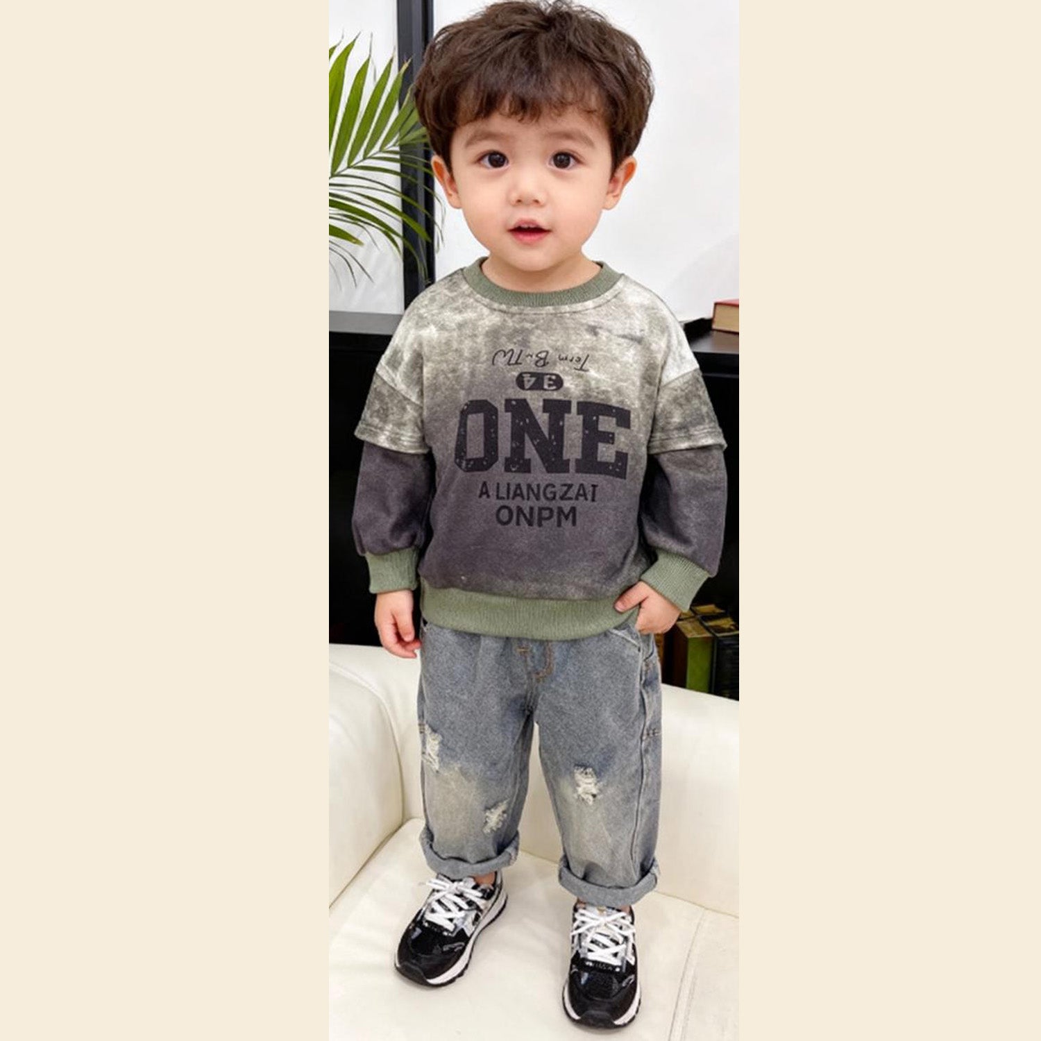 This kids’ co‑ord set pairs a washed green with dark gray sweatshirt with bold “ONE” graphic text and ribbed cuffs with relaxed, stone‑washed grey jeans featuring light distressing and an elasticated waist for comfort. The combo gives a cool, street‑style look that’s easy to move in and perfect for everyday wear or casual outings.